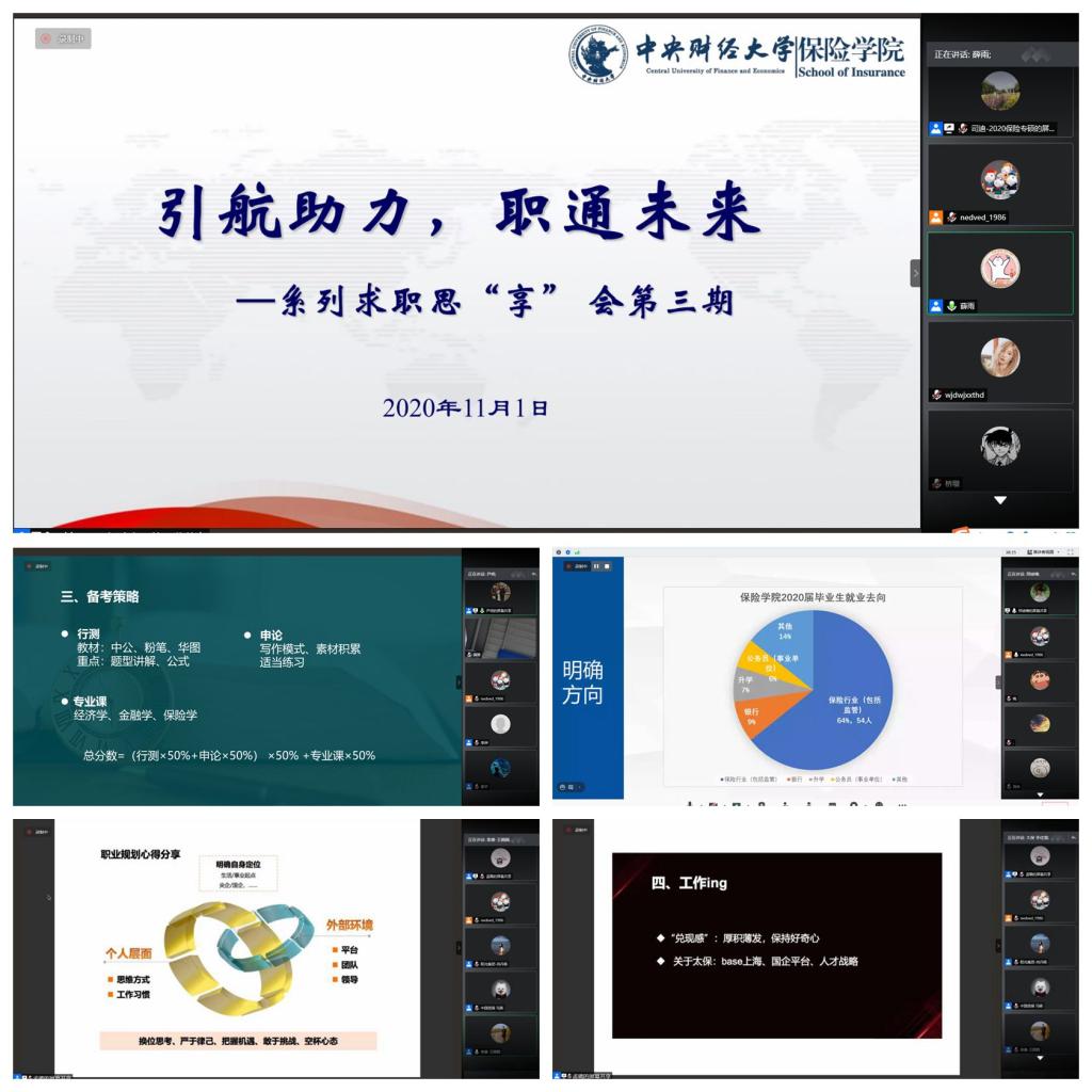 为帮助必赢nn699net官网研究生同学进一步明确未来职业规划方向,了解不同机构的工作范畴和工作情况,必赢nn699net官网展开“引航助力,职通未来”求职思“享”会,邀请就职于大型保险公司、银保监会等优秀毕业生分享求职经验。受疫情影响,该系列分享会均采取线上方式进行。该系列求职经验分享会进一步加深了研究生新生对未来求职方向的明确认识,帮助同学们有效地进行职业规划,提升自身的综合能力,合理调整求职心态,提升在日后求职中的综合竞争力。