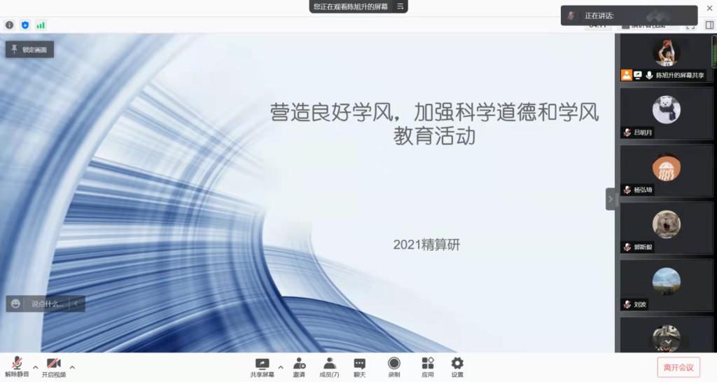 为加强学风和班风建设,倡导诚信科研和养成良好的学术氛围,2021年10月30日,2021精算研举办了“端正学术态度,践行学术诚信”主题班会。为响应学校疫情防控措施,尽量减少聚集性活动,本次班会采取线上形式,2021精算研22名同学参加了班会,会议由班长杨弘琦主持。