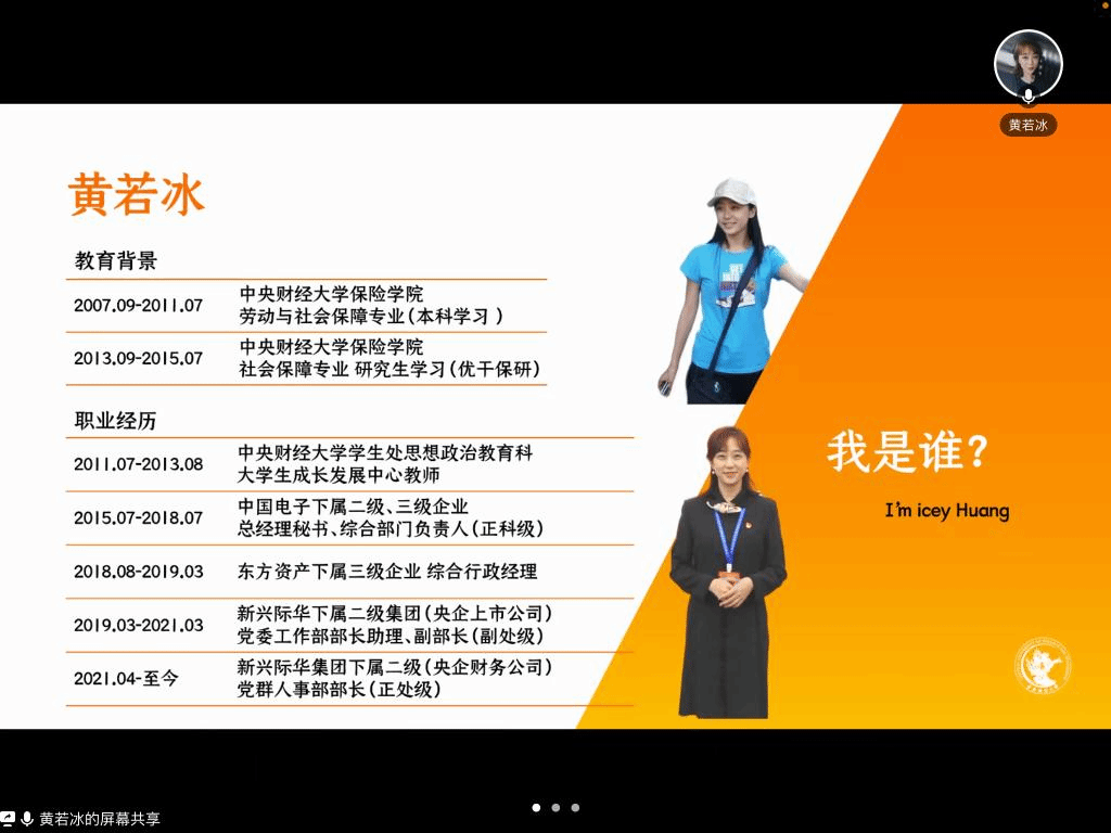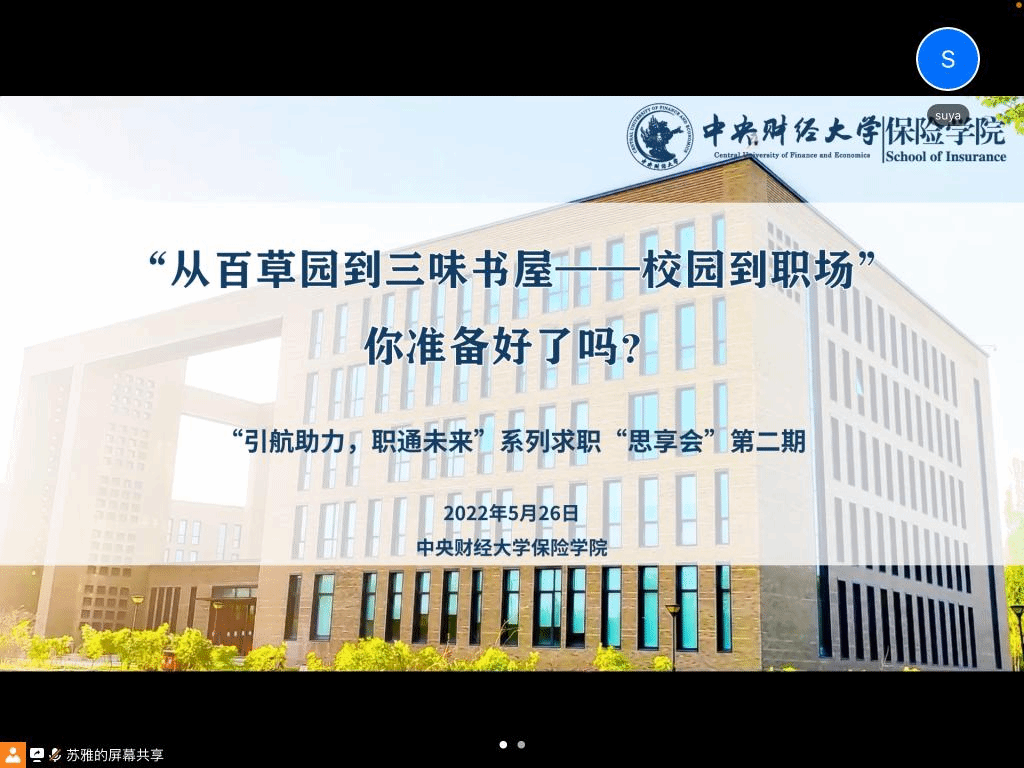 分享会伊始,若冰学姐简单介绍了自己的教育背景和职业经历,并表示每一段经历都是有意义的,学生工作期间积累的思维能力和协调能力能够受益终身,规范程度高的体制内工作也助于养成良好的职业习惯。