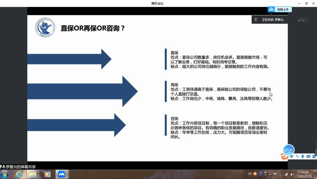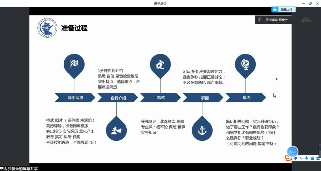首先,罗允雅学姐简单介绍了财险、寿险,直保、再保或咨询等不同岗位的工作内容,强调要通过实习,从实务层面上找准个人职业发展方向。然后详细梳理了中国人寿、中国人保、泰康人寿、阳光、平安财险、慕再、瑞再、中再等公司秋招的流程,给出了简历投递、自我介绍、笔试、面试过程中要注意的事项以及准备方法。再次,罗允雅学姐列出了大家在就业中比较关心的户口、薪资等问题,并且就如何权衡这些因素给出了自己的建议。最后,学姐希望大家能在求职中保持稳定平和的心态,相信自己一定能去到适合自己的岗位。