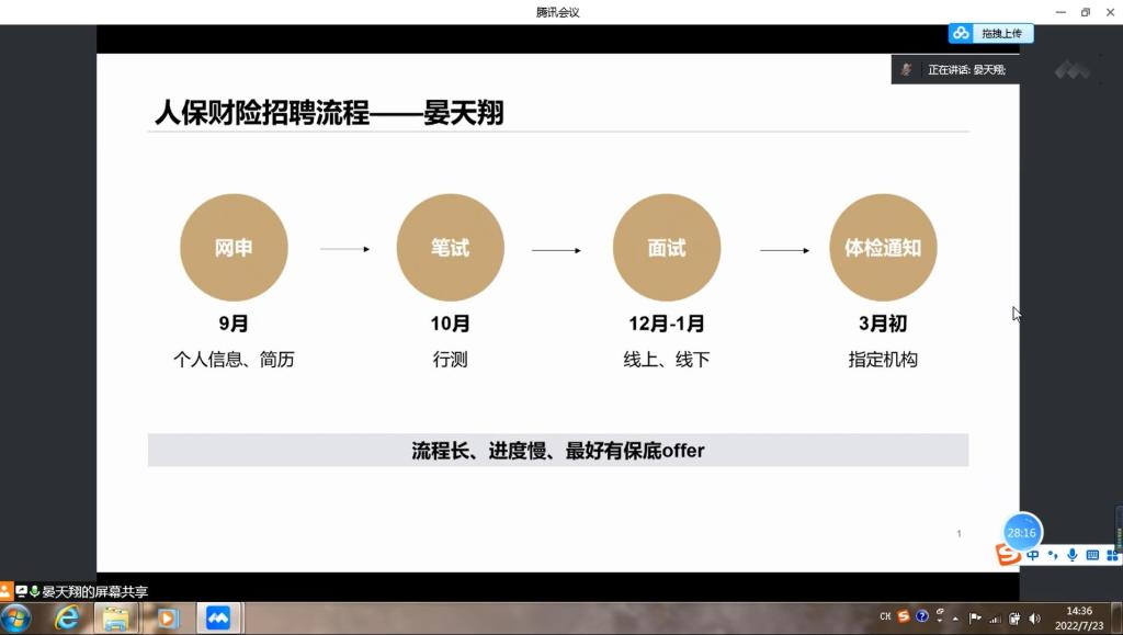 随后,晏天翔学长介绍了人保财险的招聘流程,指出需要根据公司和岗位的特质、需求,修改自己的简历,要十分熟悉自己的简历,以应对面试中可能出现的各种问题。由于人保财险offer发出的时间很晚,学长建议大家最好要有保底的offer。最后,学长提到每人有唯一一次三方违约的机会,希望大家要慎重使用,尤其是要考虑违约带来的成本,以及时间耗费是否会影响到后续的求职进度。