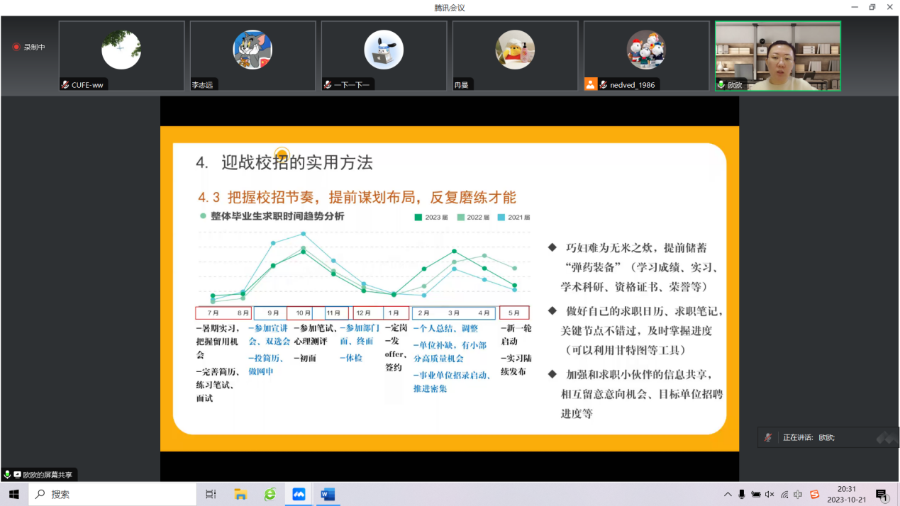 露沾草,风落木,岁方秋。金秋十月,秋招正在如火如荼的开展中。2023年10月21日晚,必赢nn699net官网在线举办了“引航助力,职通未来”系列活动之就业形势分析与对策建议主题分享会。学院邀请了生涯规划师、生涯测评师,学校学生就业创业指导中心副主任欧萌老师为我们带来了更加具体的就业信息和求职指导,让我们一起来看看吧!
