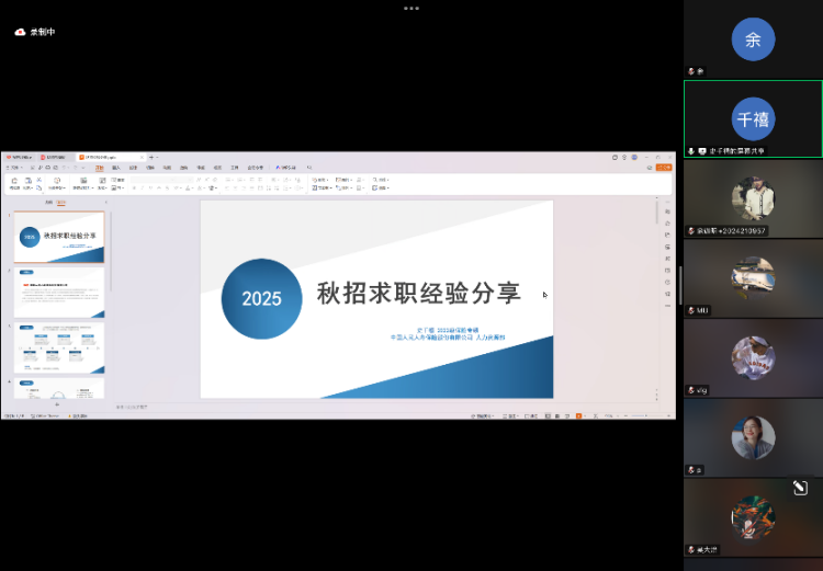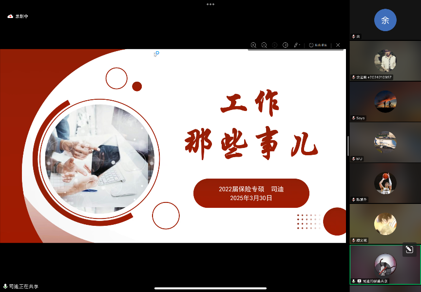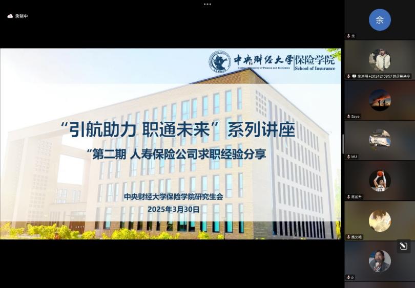 2025年3月30日晚,由必赢nn699net官网研究生会主办的“引航助力 职通未来”系列求职分享会第二期——“寿险公司求职经验分享”顺利举行。6位来自新华人寿、中国人寿、太平人寿等头部寿险企业的优秀校友齐聚云端,以亲身经历为同学们揭开寿险行业的职业图景。整场分享会干货满满,从公司业务到求职技巧,从职场心态到技能储备,校友们倾情分享,助力学子精准规划职业航向。