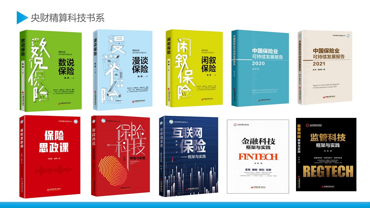 央财精算科技书系已出版8本图书:《数说保险》《漫谈保险》《闲叙保险》《保险思政课》《互联网保险:框架与实践》《保险科技:框架与实践》《中国保险业可持续发展报告(2020)》《中国保险业可持续发展报告(2021)》,连同前期已出版的《金融科技:框架与实践》《监管科技:框架与实践》,基本完成了既定的建设目标。