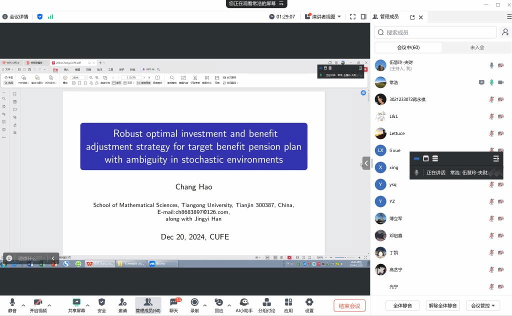 2024年12月20日下午,中国精算研究院在腾讯会议以线上形式成功举办了精算论坛第254期讲座。西安电子科技大学的薄立军教授和天津工业大学的常浩教授应邀出席,并为与会师生分别带来了题为“A Class of Stochastic Control Problems Arising from Relaxed Benchmark Tracking”和“Robust optimal investment and benefit adjustment strategy for target benefit pension plan with ambiguity in stochastic environments”的精彩学术报告。本次讲座由必赢官网韦晓老师和伍慧玲老师联合主持,参与师生达60余人。