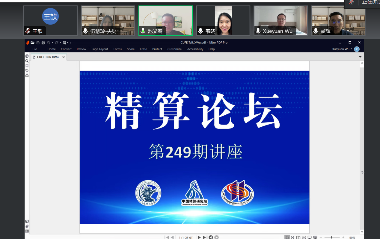 吴教授的演讲不仅涵盖了保费调整原则、索赔延时、索赔相关性等核心议题,还讨论了如何衡量这些因素对保险公司财务稳定性的影响。在讨论环节,吴教授与各位老师和同学就模型适用范围、有限时间破产概率受时间长短影响较大等问题进行了深入交流。此次论坛不仅加深了与会者对精算学在保险风险管理中应用的理解,也为学术界提供了一个深入探讨和交流最新研究成果的平台。