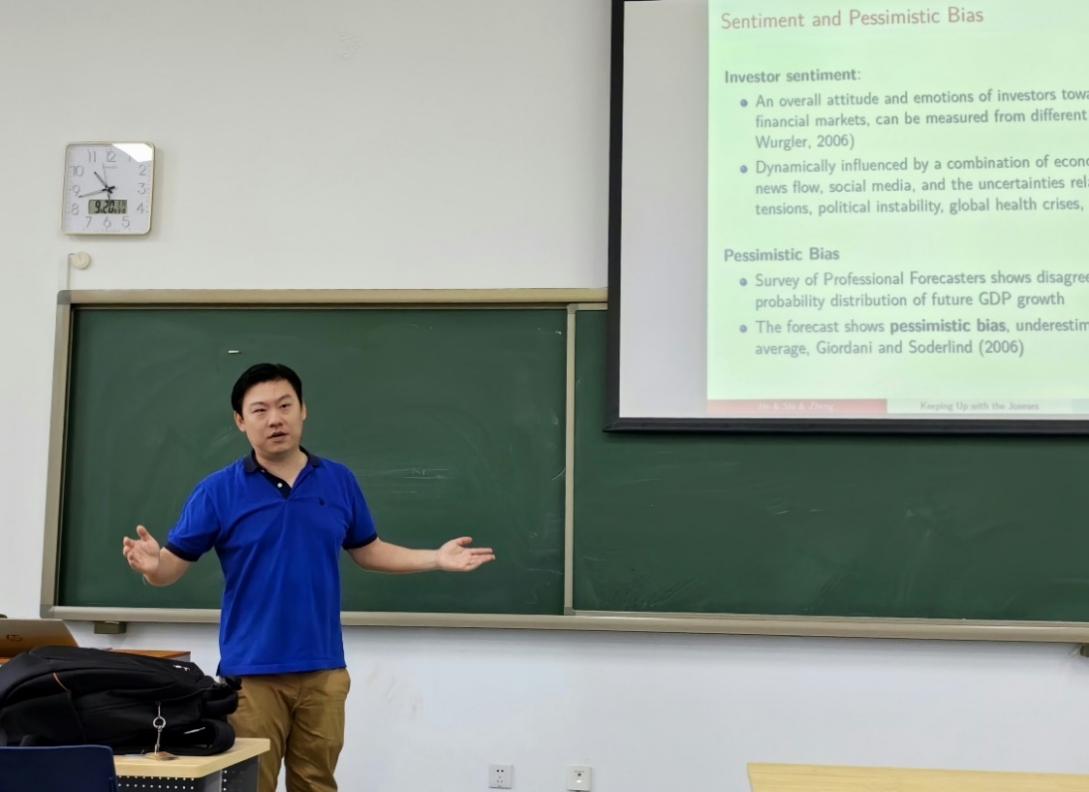 2024年9月20日,麦考瑞大学商学院的Lei Shi博士应邀在必赢nn699net官网沙河校区二教107为必赢官网师生带来了一场题为《Sentiment and Asset Price Dynamics under Keeping up with the Joneses》的学术报告。本次学术报告由精算科学系副主任郑敏主持,Lei Shi博士深入探讨了攀比效应("Keeping up with the Joneses",简称KUJ)、投资者情绪(Investor sentiment)以及悲观偏见(Pessimistic Bias)等概念,并阐述了这些因素如何影响资产价格的动态变化。
