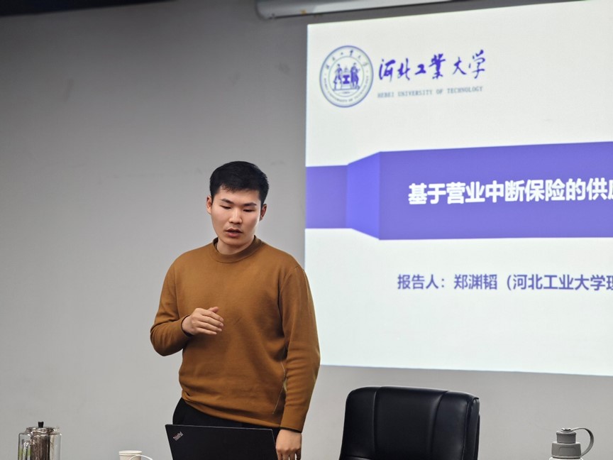 最后,河北工业大学郑渊韬进行了题为《基于营业中断保险的供应链决策研究》的学术报告,分享了他与导师所做研究的最新进展。报告以接近生活的简化的面包生产过程为例引入了供应链的概念,再从我国国情和政策出发,介绍了我国面临的营业中断风险和我国政府为减轻营业中断风险损失做出的努力。此后,报告讲述了其有无营业中断保险两种情况下的具体模型,用斯塔克尔伯格领导者模型分析零售商、供应商两方面的决策;分析了营业中断保险对制造商、零售商批发价、利润的影响和对制造商保费支付、零售市场价格和保险商利润的影响。研究发现,存在一个合理的费率区间,在此区间内,保险商、批发商和零售商的境况均可以得到改善。在报告的最后,郑渊韬分享了此领域还可能进行的拓展和深入的研究,使在座师生深受启发。