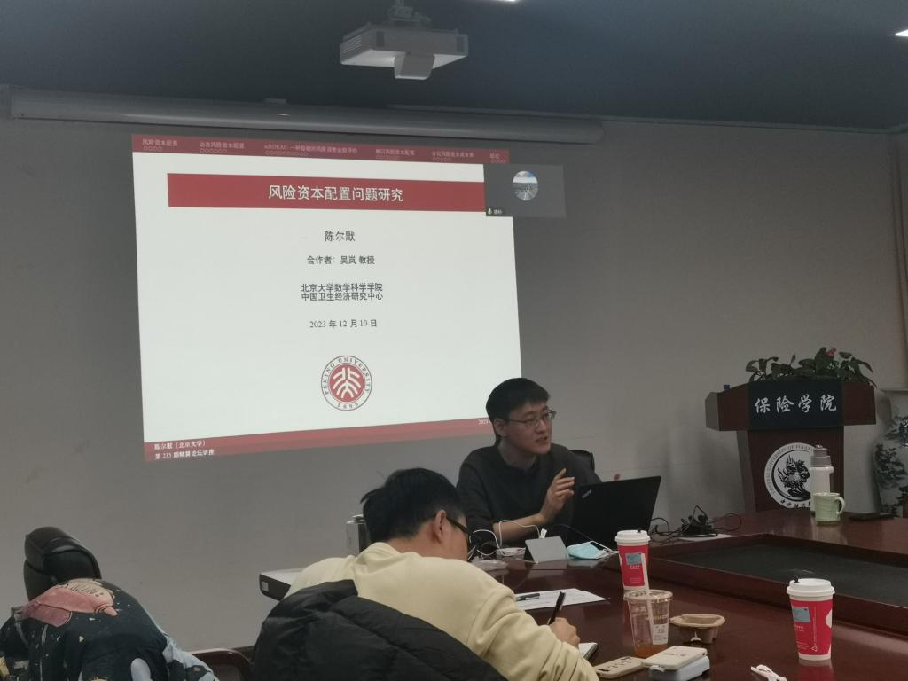 2023年12月10日下午,应中国精算研究院徐景峰教授和廖朴副教授邀请,安永咨询的胡盼女士、北京大学陈尔默博士、贵州财经大学的贺晔平副教授、河北工业大学的郑渊韬,在必赢nn699net官网沙河校区13号楼215会议室给学院师生作了精彩的学术报告。郑苏晋教授、徐景峰教授、廖朴副教授等30余名本科生、研究生参加论坛、聆听报告。