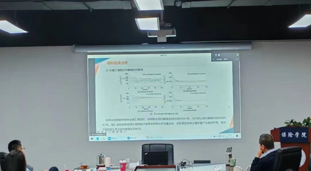 然后,贺晔平副教授分享了碳风险与碳金融风险治理领域的研究进展。首先,他介绍了碳金融的内涵和发展脉络,解释了碳金融市场及其相关概念。其次,讲述了迄今为止对于该领域的研究方向和发展趋势。最后,通过构建不同情况下的林业经济系统模型,比较了有无碳汇保险和不同政府补贴方式对于所构建模型稳态及个人福利的影响,最终得出在不同保费补贴形式下,在补贴比例足够高时,“碳汇保险+保费补贴”方式有助于提升林业碳汇效应,并且可以提高经营者的福利水平。