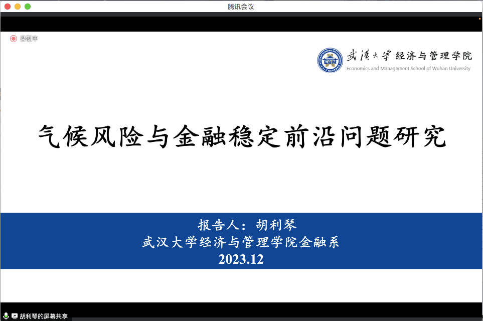 2023年12月7日上午,必赢nn699net官网中国精算研究院在线上举办第236期精算论坛。本次论坛邀请了来自武汉大学经济与管理学院副教授胡利琴老师进行学术分享。胡老师于2007年获得武汉大学经济与管理学院博士学位,专业方向为金融工程,长期致力于金融机构风险管理、资产定价领域的研究,先后主持完成多项国家自然科学基金项目和教育部项目。本次论坛中,胡老师分享了她近两年来重点研究关注的课题领域:气候风险与金融稳定前沿问题研究。本次论坛由中国精算研究院韦晓老师主持。