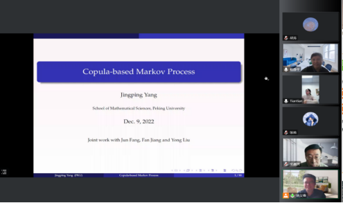 首先,杨静平教授做题为《Copula-based Markov Process》的报告。他从一个二元copula族出发,研究了其构造马尔可夫过程的可能性。由于转移函数在构造马尔可夫过程中起着核心作用,因此copula族需要满足CK方程。为了克服copula偏导数在有些点上可能不存在,他提出了修正的部分Dini导数。进一步,他通过给定一个二元copula族,给出马尔可夫过程存在的充分条件。他还模拟了一些典型的基于copula的马尔可夫过程的路径,以表明将copula方法应用于随机过程框架的重要性。