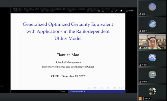 第三位报告者为毛甜甜副教授。她报告题为《Generalized Optimized Certainty Equivalent with Applications in the Rank-dependent Utility Model》。Ben Tal和Teboulle(1986)提出利用经典优化确定等价量(OCE)模型来评估随机风险,在该模型中,每个决策者都具有唯一的概率度量,并且只假设结果不确定性。由于缺乏信息,在现实中普遍存在着分布模糊性或不确定性。她使用Maccheroni等(2006)的变分偏好来解决这个问题并推广OCE的概念。在报告中,她通过引入了一类基于变分偏好研究OCE,给出了其基于varphi散度的对偶表示,并研究了其正齐性和一致性风险度量的等价条件。作为应用,她探讨了基于秩相关效用(RDU)模型的OCE性质。