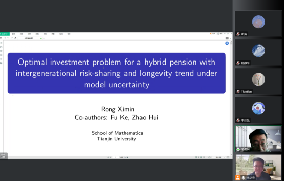 接着,荣喜民教授报告《Optimal Investment Problem for a Hybrid Pension with Intergenerational Risk-sharing and Longevity Trend under Model Uncertainty》。他讨论了模型不确定性下混合计划的最优投资问题,其中贡献和收益都根据计划的绩效进行调整。此外,年龄和时间相关的死亡率和线性最大年龄被认为可以捕捉长寿趋势。进一步假设养老金计划的经理不喜欢模糊性,并可将养老金投资于无风险资产和股票。计划管理者旨在通过最小化最坏情况下的不稳定贡献风险成本、不稳定收益风险成本和不可持续风险,找到最优投资策略和最优代际风险分担安排。通过应用随机最优控制方法,在惩罚的二次成本函数下导出了闭式解。通过数值分析,发现集体混合养老金计划有效地实现了代际风险分担。