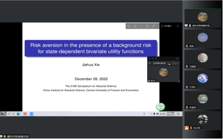 最后, 谢杰华教授做了题为《Risk Aversion in the Presence of a Background Risk for State-dependent Bivariate Utility Functions》的报告。他探讨了不仅存在背景风险,而且期望效用函数存在不确定情形,个人对关注的风险表现出厌恶特征而对效用函数提出要求。报告中,他用二元效用函数来刻画个人对关注的风险与背景风险的偏好,并引入新的维度来对效用函数不确定进行建模。他拓展了前人的研究成果,给出了在此分析框架下对关注风险厌恶的充分条件。