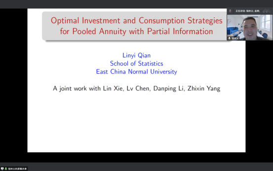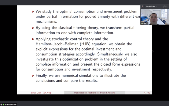 钱林义教授报告题目为“Optimal Investment and Consumption Strategies for Pooled Annuity with Partial Information”。文章主要研究了在部分信息、GSA(Group Self Annuity)养老产品下的最佳消费和投资组合选择。假设GSA产品参保人是同质(年龄、初始资本、偏好等一致)的,以及信息不完全(金融市场、参保人的死亡率等不可观测)情形下,最大化参保人的消费效用和终端财富效用的加权和。主要使用滤波理论、测度变换,把原本不可观测的模型转换为可观测模型,并在此模型下,利用动态规划原理求解最优消费和投资策略的显示解,继而研究了折现率等参数对策略的影响。