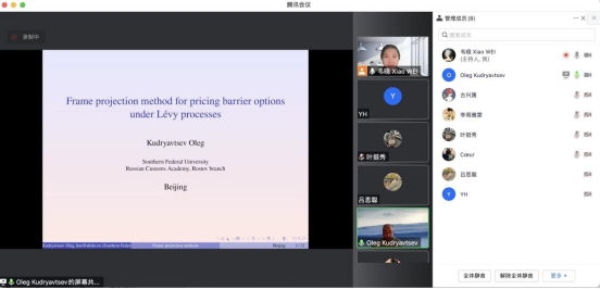 在本次论坛第一个报告中,Kudryavtsev教授介绍了运用Frame Projection方法对Levy模型下障碍期权定价的研究。他首先介绍了几种期权的特点,指出了障碍期权在定价中的要点和难点,接着他分析了传统的定价方法的优劣性,从而引出了Frame Projection方法在障碍期权定价的可行性和优势,然后他详细介绍了Frame Projection方法的原理,推导出在Levy模型下Frame Projection方法对障碍期权的定价公式,最后他展示了用Frame Projection方法对障碍期权定价的数值测试。测试结果显示,通过该方法能快速且准确地给出障碍期权的价格。