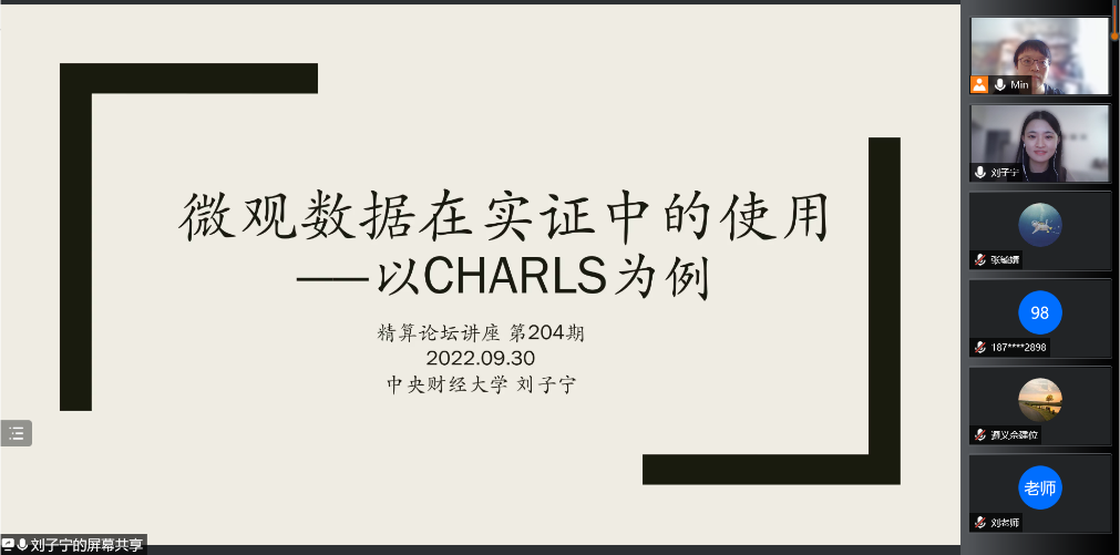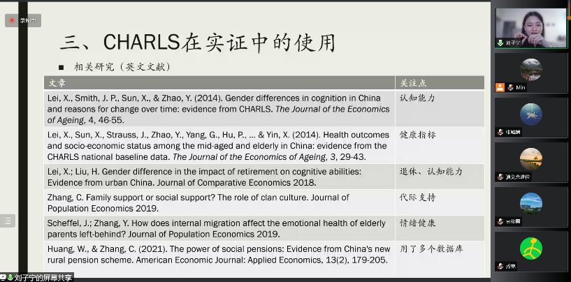 刘子宁博士报告的题目为“微观数据在实证中的使用——CHARLS为例”。首先,刘子宁介绍了常用的数据类型,重点介绍了国内常用的公开微观数据库,并且以CHARLS为例分析了如何使用微观数据来分析感兴趣的问题。其次,刘子宁介绍了其他途径获得的数据。比如通过自己设计调查问卷来获得一手数据,或者通过行政机构获得行政数据。这两类数据较公开的微观数据库更难以获得。此外,刘子宁介绍了通过爬虫历史文本和网络数据获得的数据以及气象和环境等自然科学领域的数据。这类数据往往可以用来关注一些跨领域的研究问题。最后,刘子宁介绍了不同类型数据之间的整合,用于服务相关的研究问题。