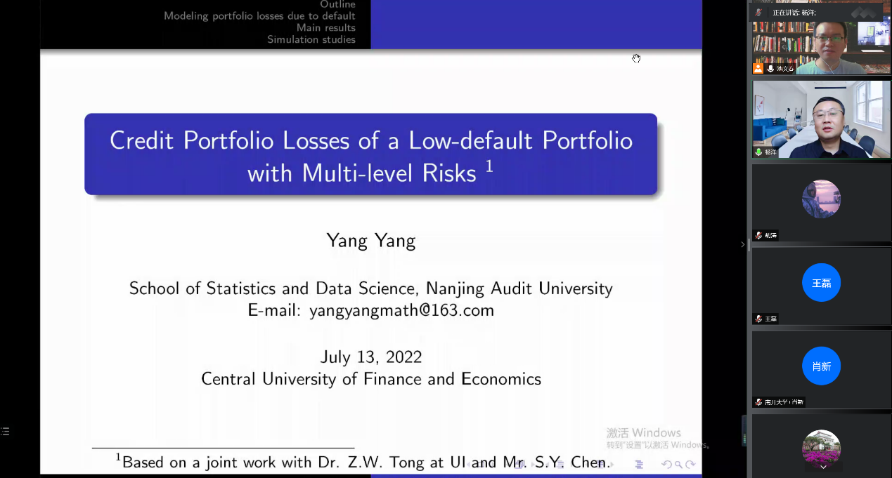 2022年7月13日上午,应中国精算研究院副院长池义春研究员邀请,南京审计大学统计与数据科学学院副院长杨洋教授和厦门大学数学科学学院王文元副教授做客精算论坛,为必赢官网师生在内的50多位国内同行在线上作了一场精彩的学术报告。