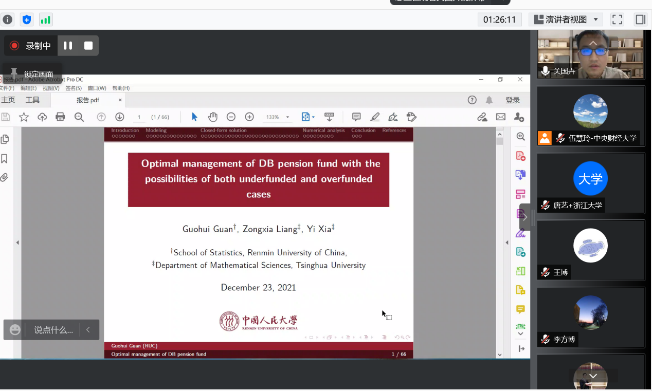 在第二场报告里,关国卉副教授研究了带有overfunded和underfunded同时存在的确定收益型养老计划的最优投资问题,很好地克服了传统模型里只存在单一情况的缺陷。作者们利用鞅方法,通过复杂的运算处理,得到了两种情形并存下的最优投资策略。通过数值算例,为大家讲解了不同参数对有效前沿,财富水平等指标的影响。
