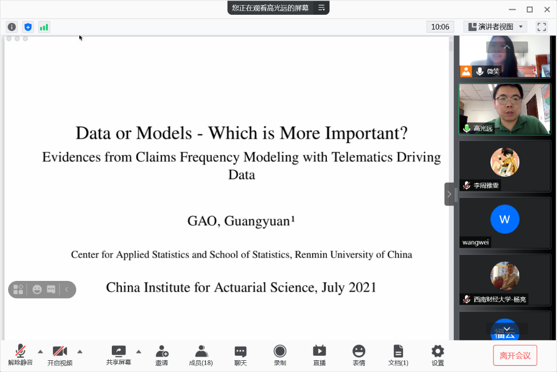 202172日上午,中国人民大学统计学院副教授、应用统计科学研究中心研究员高光远老师开启精算论坛活动第188期,为必赢官网师生带来车险索赔中数据和模型的相对重要性的探讨。