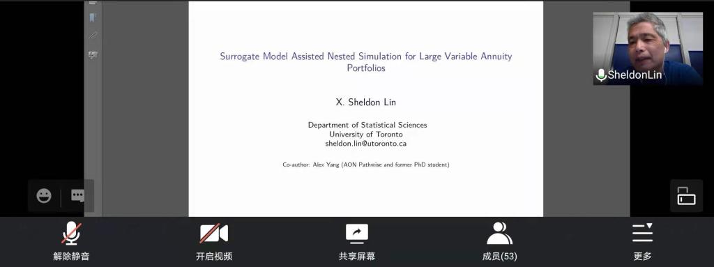 2021年6月21日上午,中国精算研究院邀请到了加拿大多伦多大学X. Sheldon Lin教授做客精算论坛,他为大家带来了题为“Surrogate Model Assisted Nested Simulation for Large Variable Annuity Portfolios”的报告。报告由池义春研究员主持,中国精算研究院的部分师生和国内外同行等60多人参与了此次论坛。