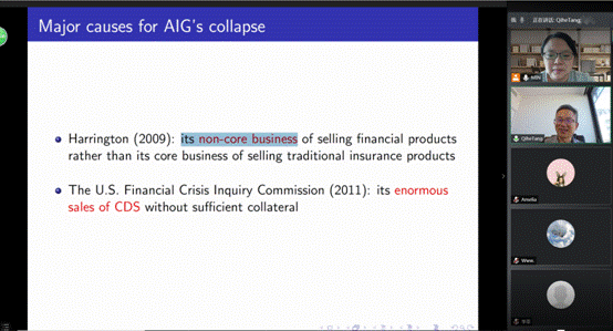 报告结束后,Tang教授就保险公司非核心业务面临的风险以及核心业务与非核心业务之间的关系与参与论坛的师生进行了深入地探讨,与会师生受益良多。 感谢我校引智项目给予的支持。