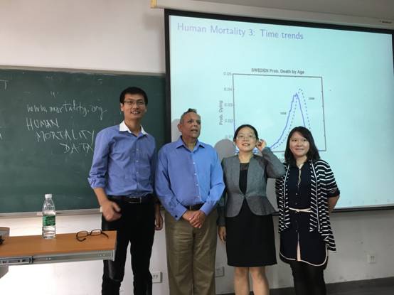 2017年9月27日下午14:00-18:00于沙河校区主教208教室,中国精算研究院邀请到了斯坦福大学人口研究院Virginia Morrison终身教授、院长,加州大学伯克利分校经济与老龄化中心研究员Shripad Tuljapurkar 教授为大家带来了短期课程“Forecastingmortality”,该次课程主要包括以下部分a) Challenges & priormethods, b) what is SVD, c) Lee-Carter methods, e) Alternative approaches andpricing,必赢官网周明副院长、伍慧玲副研究员、韦晓副研究员以及部分博士生、研究生参加了本次的讲座。