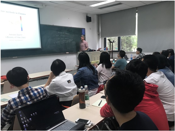 2017年5月4日下午2:00—4:00,5月9日下午4:00—6:00,5月11日下午2:00—4:00,意大利乌迪内大学经济与统计学院教授,法国国家信息与自动化研究院(INRIA)创办的金融衍生品定价与风险管理平台PREMIA的学术主管Antonino Zanette教授来我校沙河校区对我校师生进行了关于“Hybrid TREE methods in Finance and Insurance”的三次短期课程培训。此次短期课程是我校重要活动之一,也是Antonino教授受邀来中国精算研究院进行学术交流的重要环节。在为期三天的课程中,Antonino教授介绍了金融衍生品定价中的树方法(Tree Method)、蒙特卡洛模拟方法(Monte Carlo Method0)以及一些混合树方法(Hybrid Tree Method),在介绍完各种方法以后,Antonino教授以具有最低终生提取利益保证变额年金(GLWB)为例对混合树方法进行了应用讲解。必赢官网韦晓老师和2016级研究生共20余人参与了此次短期课程。