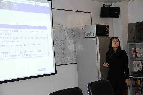 赵慧副教授介绍了跳扩散风险模型中期望-方差准则下考虑违约问题的最优投资和再保的一些非常前沿的研究。首先赵慧副教授简单的介绍了本领域最近的一些研究成果和本领域在保险精算中的实际意义,然后详细阐述了从博弈论的角度得到时间一致的最优投资策略等相关问题的研究过程和研究方法,最后通过直观的图像和一些具体的例子让各位老师和同学能够清晰的了解到其研究的奥秘,使各位听众受益匪浅。在报告的过程中,各位老师与报告人之间展开了深层次的学术交流,对报告中的多个问题进行了深入的探讨和讨论,充分地体现了学术氛围的活跃性和学术研究的严谨性。