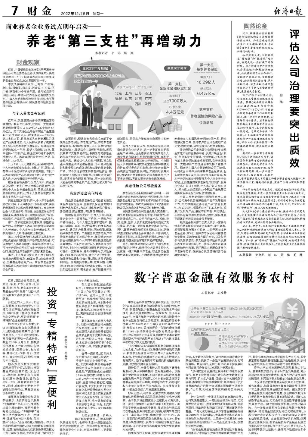 2022年12月1日,中国银保监会发布《关于开展养老保险公司商业养老金业务试点的通知》。陈辉在接受《经济日报》采访时表示,商业养老金融产品既要应对通货膨胀风险,又要面对长寿风险,希望通过养老保险公司试点能够给消费者更多选择权,真正实现养老资金保值增值。
