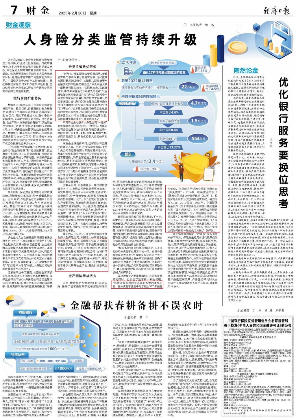 2023年4月3日,中国人民银行发布《2023年第一季度城镇储户问卷调查报告》。陈辉在接受《经济日报》采访时表示,目前保险产品在个人金融资产配置中的占比约为6%,相较于欧美市场有一定距离,随着养老需求逐步上升,养老保险产品有望成为刚需。总体来看,家庭资产配置的重点将逐步由房地产转向金融资产,银行理财、货币基金、保险产品等将愈发受到市场青睐。与银行理财市场类似,保险市场也需要供给侧结构性改革。当前,保险机构更多依靠“高保证收益”吸引客户,保险产品的创新步伐滞后于消费者的需求变化;此外,保险市场的自身风险也没有完全出清。从长期发展看,保险业要打造“产品+服务”模式,并持续优化、升级产品与服务,注重效率的提升。接下来,保险业要进一步聚焦长期与保障型业务,特别是健康险、养老保险产品。