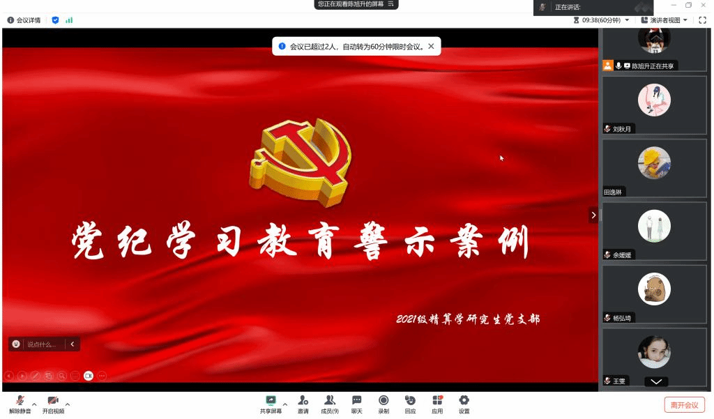 本次警示教育会议通过观看真实案例,使支部党员更深刻的感受到党纪学习教育的重要性,这不仅是对违纪者的惩罚,更是对全体党员的警醒和教育,2021级精算学研究生党支部将继续按照学院党委的部署,把握好党纪学习教育的整体节奏,继续开展好警示教育。