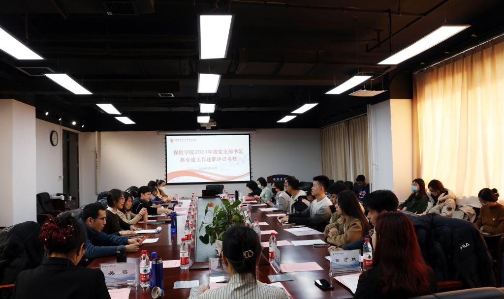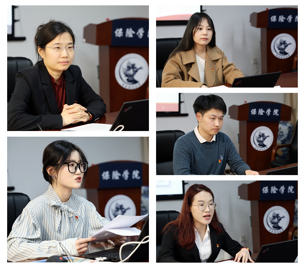 2022级保险专硕党支部书记尹秀洁总结了支部“读书分享周”特色活动,切实把学习贯彻习近平新时代中国特色社会主义思想主题教育落实到实处,未来将加强党建工作的创新性,大胆实践,增强党建活力,推动党建工作的转型与升级。2023级学硕联合党支部书记王一陶总结工作尚存在理论学习成效不明显、党建互动特色亮点不足、典型选树力度不够等问题,并表示,2024年将提高政治站位,强化党建引领,在组织生活形式上求新求变,切实提高党建工作质量。2023级保险专硕党支部书记黄可轶从强化组织建设、规范党员发展、做好教育管理等方面总结2023年主要工作,并就支部组织建设、支部内党员沟通等方面存在的问题提出了切实的解决方案与工作计划。本科生第一党支部书记吴蓓从突出“青春+”品牌,打造亮点支部、突出“党建+”工作,实现人才培养融合发展两个方面讲述抓党建工作长效机制,并表示未来将立足于新时代党的建设总要求,继续以高度的责任感和使命感做好基层党建工作。本科生第二党支部书记秦然从健全政治理论学习制度、支部规范化建设、党建带团建等方面总结工作,未来将不断提升支部思想政治建设,将高质量党建引领班级高质量发展作为发展目标。