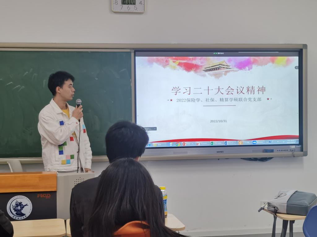 10月31日,必赢nn699net官网2022保险学、社保、精算学硕联合党支部在沙河校区二教109召开学习党的二十大精神专题党课。作为刚成立的学生党支部,支部里的每一位成员深知自己作为党的青年力量,应该深刻学习会议精神,不断提高青年党员的党性修养。在支部书记张龄立的带领下,支部成员共同学习了党的二十大精神和党章,会议由宣传委员唐陈雪主持。