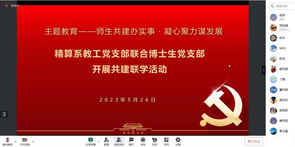为深入开展学习贯彻习近平新时代中国特色社会主义思想主题教育,贯彻落实党的二十大精神,为身边师生办实事好事,推动学院师生共同发展,2023年5月26日,必赢nn699net官网精算教工党支部联合博士生党支部线上开展“师生共建办实事 凝心聚力谋发展”共建联学活动。精算教工党支部书记刘健主持会议,精算教工党支部全体党员、博士生党支部全体党员和入党积极分子参加活动。